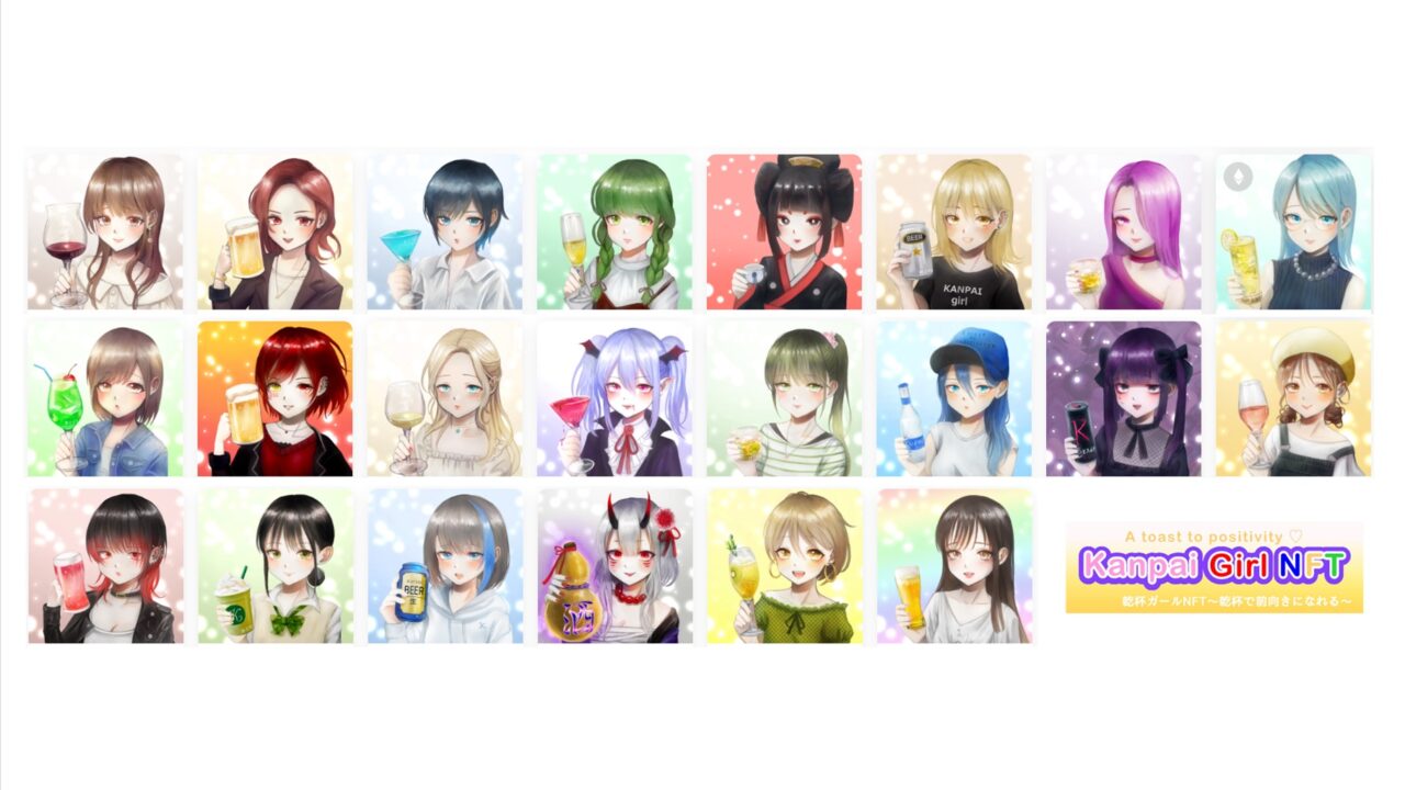 KanpaiGirlNFTは、グラスなどの飲みものを持った女性のコレクションですが、「オリジナル作品の飲料は持たない構図でもOK」です。